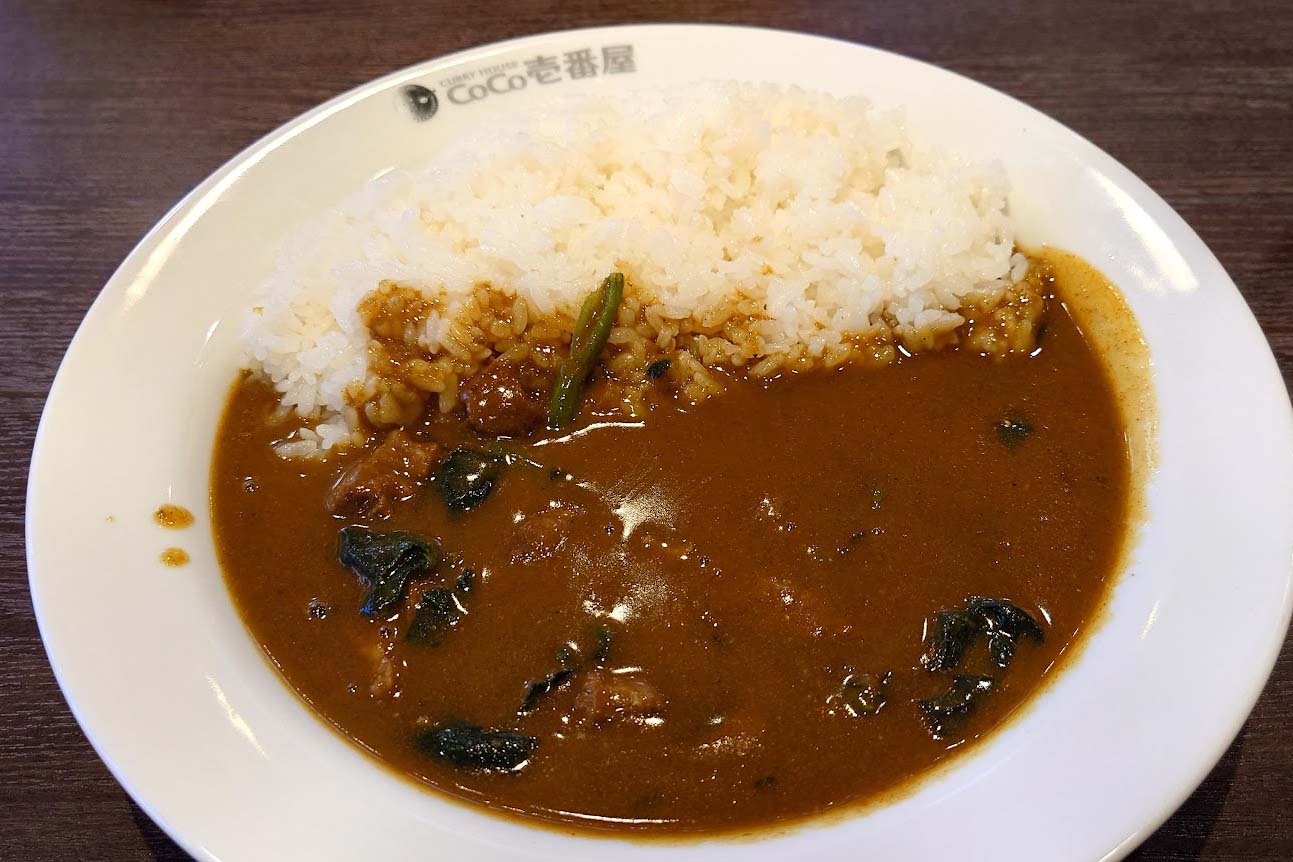上の写真は、ビーフカレーの2辛にハーフホウレンソウトッピング