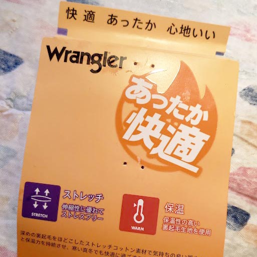 投稿日: 12/26/202512/25/2025 投稿者: eztomあったか快適Wrangler急に寒くなりましたね。夏に激安だった、「あったか快適Wrangker」を買ってあった。3000円しなかったのよ。あまりに安いので買ったんだけど忘れてた。笑裏起毛の生地でストレッチもする。それに加えて、ウエストにもエラスティックが入ってる。で履いてみると、素晴らしい。冬限定やと思うけど、快適です。春や秋でも暑いと思うわ。また安かったら、もう1本買うかな?